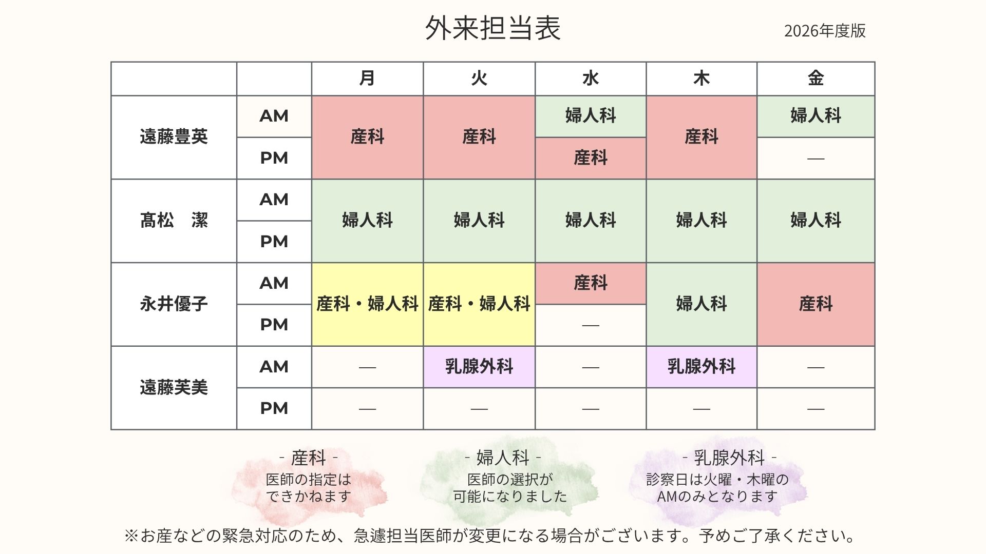 4月からの外来担当表を更新しました。婦人科は医師の選択が可能です。
